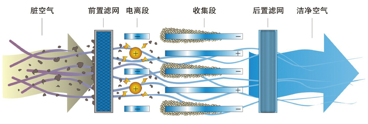 廢氣在一定高電壓的電場(chǎng)中經(jīng)過(guò)時(shí),被電場(chǎng)中電暈放電的大量電荷撞擊,油煙氣中的大量油粒子被高度電離,分解、炭化,并產(chǎn)生大量的負(fù)離子,使懸浮于油煙氣中的油粒子帶電。荷電的油粒子在電場(chǎng)力的驅(qū)動(dòng)下向集塵管運(yùn)動(dòng),到 達(dá)極管失去電荷,最后沉積在集塵管上;工作的同時(shí)會(huì)產(chǎn)生高濃度臭氧,可有效降低煙氣中富含的部分臭味濃度,凈化后的達(dá)標(biāo)氣體被排向大氣。