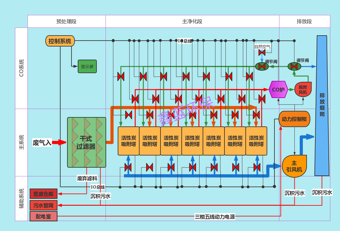 當有機廢氣的流量大、濃度低、溫度低、采用催化燃燒需消耗大量的燃料時,可先采用吸附手段將有機廢氣吸附于吸附劑上并進行濃縮,然后通過熱空氣吹掃,使有機廢氣脫附成為高濃度有機廢氣(可濃縮10倍以上)后再進行催化燃燒。