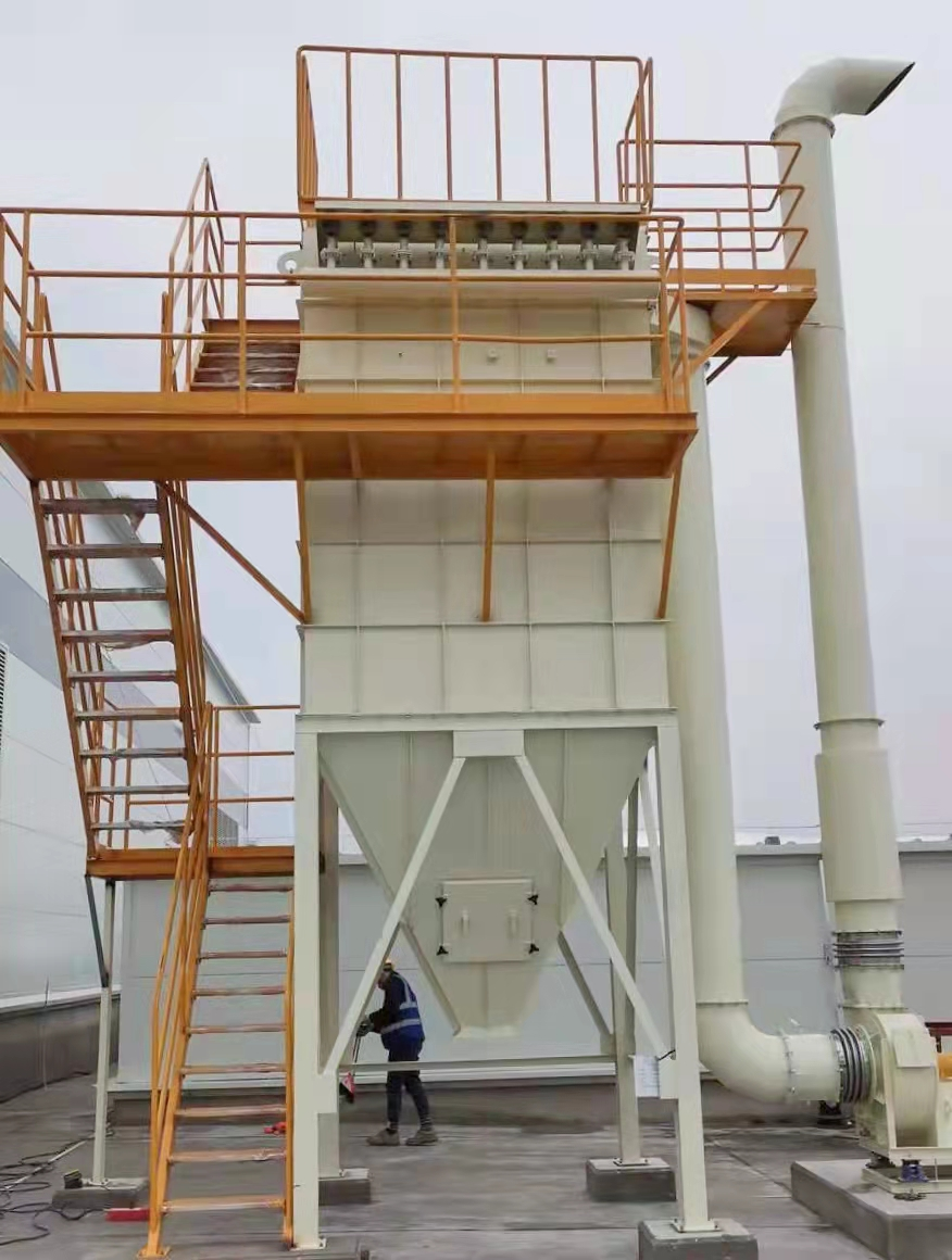 脈沖布袋除塵設備比普通布袋除塵設備具有更強的除塵能力,可以保持較高的過濾風速。每排濾袋上部安裝一根噴射管,噴射管上有一個小噴孔,對應每個除塵濾袋的中心。